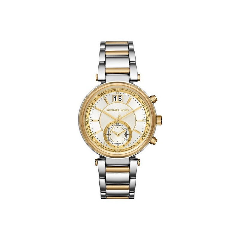 Fashion wristwatches Michael Kors Sawyer MK6225 women's chronograph with Japanese-type battery-powered quartz movement, stainless steel case with a diameter of 38 mm in gold and silver, silver dial with a circular shape with matte finish and presence of crystals with chronograph function and date , mineral glass, two-tone gold and silver stainless steel strap with folding clasp, 10 ATM water resistant