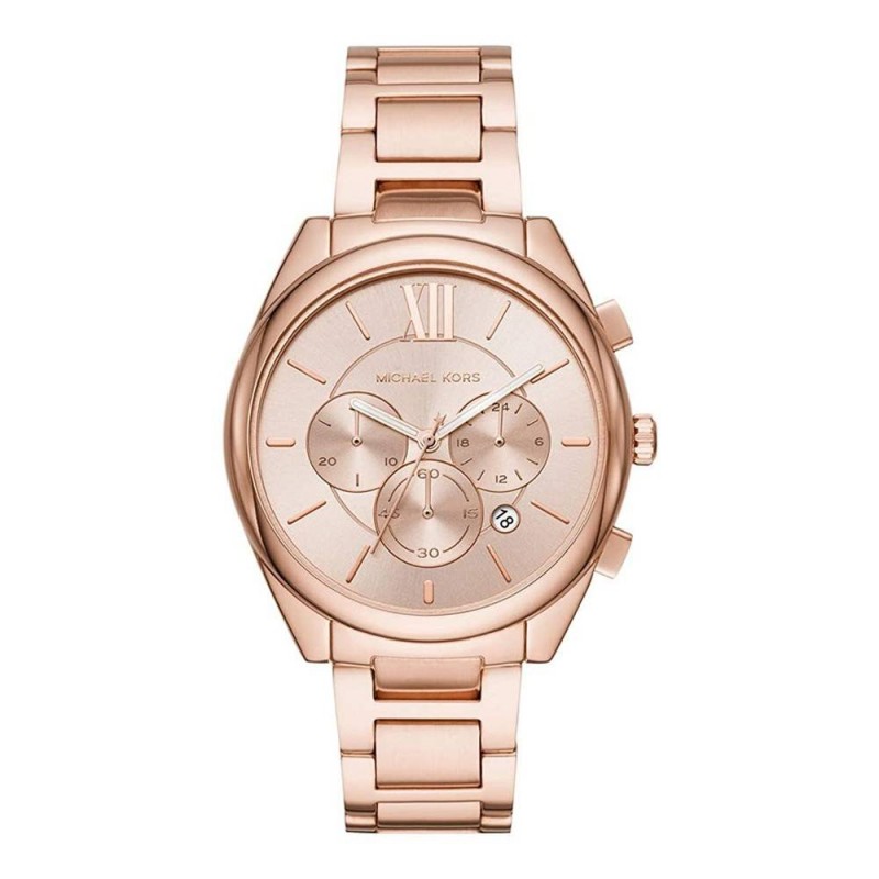 Wristwatch Michael Kors Janelle MK7108 Chronograph Woman with Quartz movement powered by Japanese type battery, case in Stainless Steel with a diameter of 42 mm in rose gold color, circular dial in Rose Gold color with mixed indexes and date function, Mineral glass and strap in rose gold colored stainless steel with folding clasp, water resistant 5 ATM