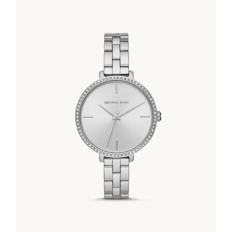 Michael Kors Charley MK4398 analogue women's wristwatch with quartz movement. Round alloy case, with 38mm silver dial, 12mm band width embellished with a crystal bezel, mineral glass, 3 hand analog display quartz movement, imported, silver and alloy bracelet, with snap closure, water resistant up to 30 meters: resists splashing water