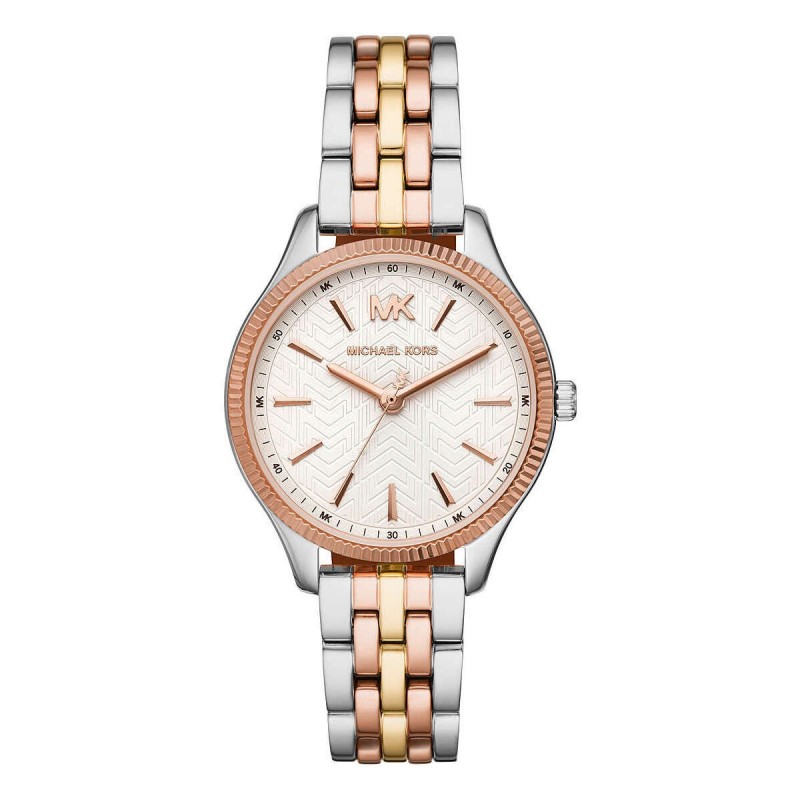 Michael Kors women's time only watch from the Lexington collection. Watch with round stainless steel case in silver color with polished finish. case size of 36 mm and thickness of 7 mm. Rose gold colored stainless steel bezel with polished finish. clear glass and white dial. Stainless steel bracelet in three colors: silver, pink and gold with a polished finish and folding clasp. Distance of the loops: 16 Mm. 5 ATM water resistance. Quartz movement. Functions: 3 spheres.