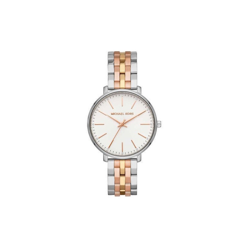Michael Kors women's time only watch from the Pyper collection. Model with round case in silver-colored stainless steel with a polished finish. Case measuring 38 mm and 7 mm thick. Ring in silver-colored stainless steel with a polished finish. The dial is white with rose gold colored stick indexes and transparent glass. Mixed finish silver rose gold tri-tone stainless steel bracelet with a fold over clasp. The distance of the lugs is 16 mm. Model embellished with crystals on the dial. The water resistance is 5 ATM. Watch with quartz movement and 3 spheres.
