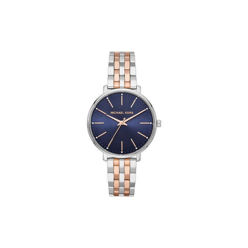 Michael Kors wristwatch from the Pyper collection with quartz movement and time only function. 38 mm diameter and 7 mm thick silver-tone stainless steel case, silver-tone steel bezel with polished finish, blue analog dial with rose gold-tone stick indexes and white crystals, logo on the top, mineral glass. Two-tone silver and rose gold stainless steel bracelet and push button deployment clasp, 5 ATM water resistant: resistant to splashes of water but not under pressure.