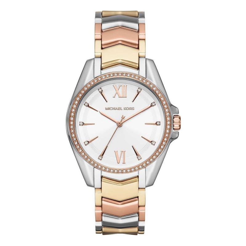 Michael Kors women's wristwatch from the Whitney collection with quartz movement and time only function. 38 mm diameter, 7 mm thick silver-tone stainless steel case, rose gold-tone steel bezel embellished with white crystal outline, white analog dial with gold-tone stone indexes and Roman numerals only at the 12 and 6 o'clock positions pink, logo on the top, mineral glass. Stainless steel bracelet in three colors silver, rose gold and yellow gold with folding clasp with buttons, water resistant 5 ATM. resistant to splashes of water but not under pressure.