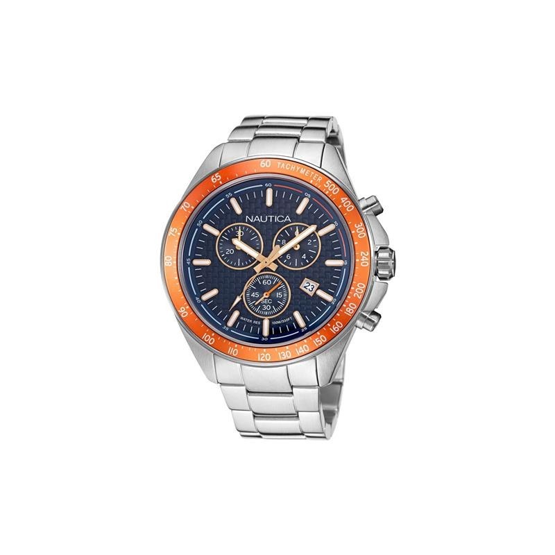 Nautica men's wristwatch with quartz movement and chronograph function with date. Round, silver-tone stainless steel case, 46 mm in diameter, screw-down case back and crown, orange steel tachymeter bezel. Blue analog dial with stick indexes, date display at 4 o'clock, logo at the top, mineral crystal. Silver-tone stainless steel strap with folding clasp, 10 ATM water resistance.