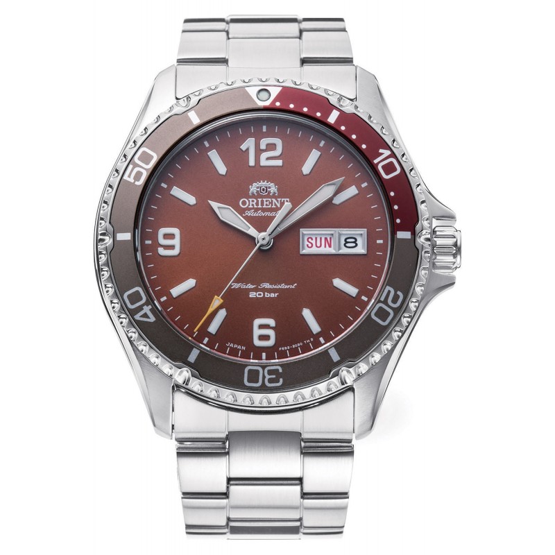 Orient men's diving wristwatch with automatic movement and time-only function with day-date and month. Round silver-tone stainless steel case, 42 mm in diameter and 13 mm thick, screw-down steel case back, brown and red enameled steel bezel with unidirectional rotating minute track. Red analog dial with stick indexes and Arabic numerals at the 12, 9, and 6 o'clock positions only, date window at 3 o'clock with day and month display, logo at the top, anti-reflective sapphire crystal. Silver-tone stainless steel strap with fold-over clasp, water resistant to 20 ATM.
