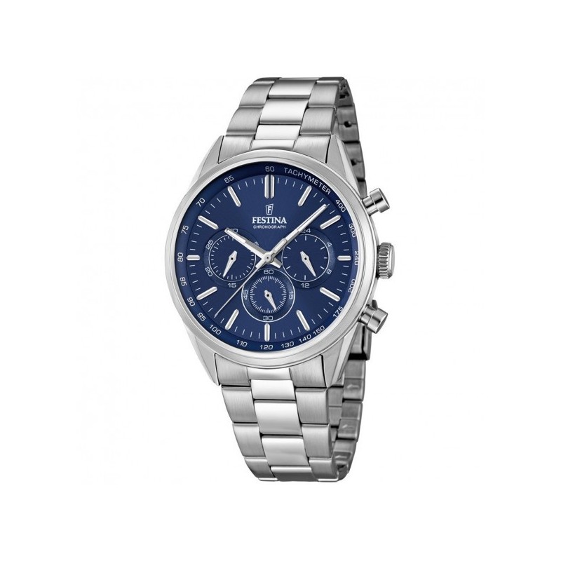 Festina men's wristwatch from the Timeless Chronograph collection with Miyota JS20 quartz movement and chronograph functions. Silver-tone stainless steel case with a diameter of 43.5 mm and a thickness of 10.8 mm, blue analog dial with stick indexes, logo on the top, mineral glass. Silver-tone stainless steel bracelet with push button folding clasp, 5 ATM water resistant: resistant to splashes of water but not under pressure.