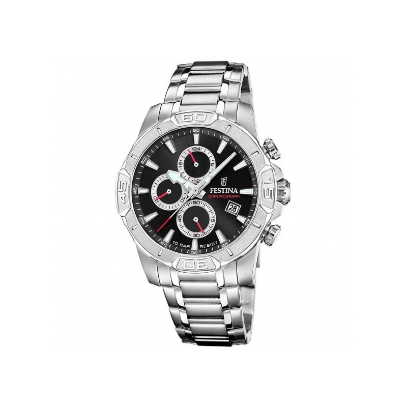 Festina men's wristwatch from the Timeless Chronograph collection with Miyota JS15 quartz movement and chronograph functions with date. Round silver-tone stainless steel case, 44 mm in diameter and 12.25 mm thick, steel case back, silver-tone steel bezel with minute track. Black analog dial with stick indexes, date display between 3 and 4 o'clock, logo at 3 o'clock, mineral crystal. Silver-tone stainless steel strap with polished and satin finish, push-button deployment clasp, 10 ATM water resistance.
