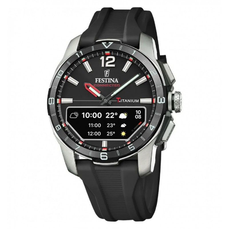 Festina men's analog digital wristwatch from the Connected D line. Silver-tone titanium case, 44 mm in diameter and 13.96 mm thick. Black analog dial with OLED digital display (no touch screen). Connects to the smartwatch via the dedicated app, sapphire crystal. Programmable side buttons. Main functions: music control, camera control, find my phone, take me home, remember this place, IFTT, weather, world time, timer, stopwatch, alarms. Black rubber strap with pin buckle, water resistant 3 ATM: resistant to splashes of water but not under pressure.