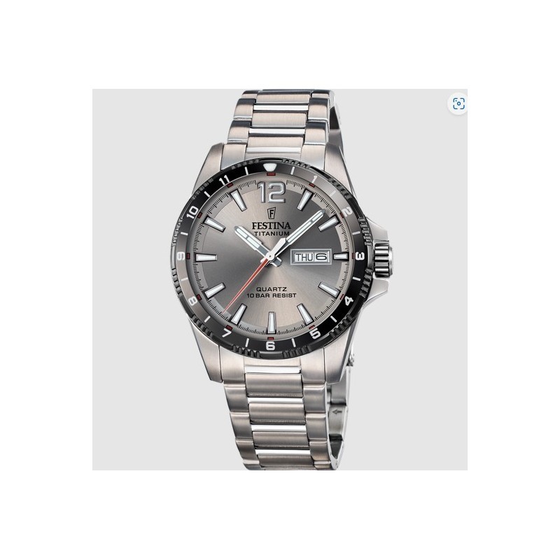Festina men's wristwatch from the Titanium collection with quartz movement and time-only function with date. Round, silver-tone titanium case, 43 mm in diameter and 10.5 mm thick, gray steel bezel with minute track. Gray analog dial with stick indexes and Arabic numerals at 12 o'clock, date window at 3 o'clock with day and week display, mineral crystal. Silver-tone stainless steel strap with folding clasp and safety catch, water resistant to 10 ATM.
