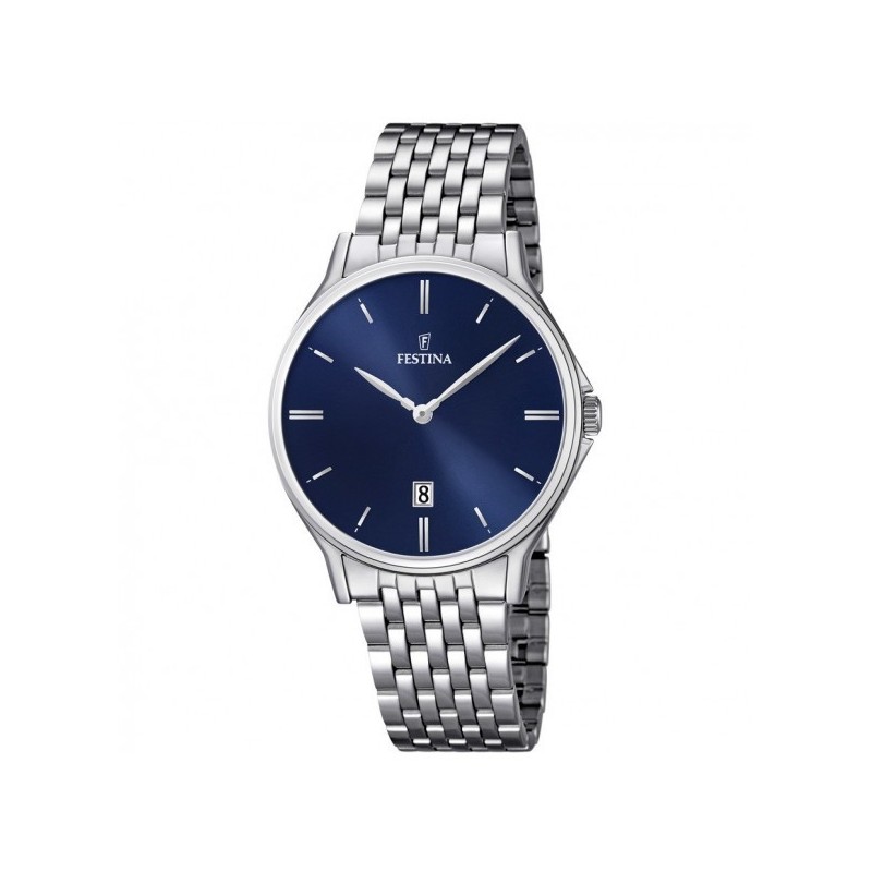 Festina men's wristwatch from the Acero Classic collection with Miyota GM15 quartz movement and time-only functions with date. Round silver-tone stainless steel case, 39 mm in diameter and 6.9 mm thick. Blue analog dial with stick indexes, date display at 6 o'clock, logo at the top, mineral crystal. Silver-tone stainless steel strap with push-button deployment clasp, water resistance 5 ATM: splash-proof but not pressurized.
