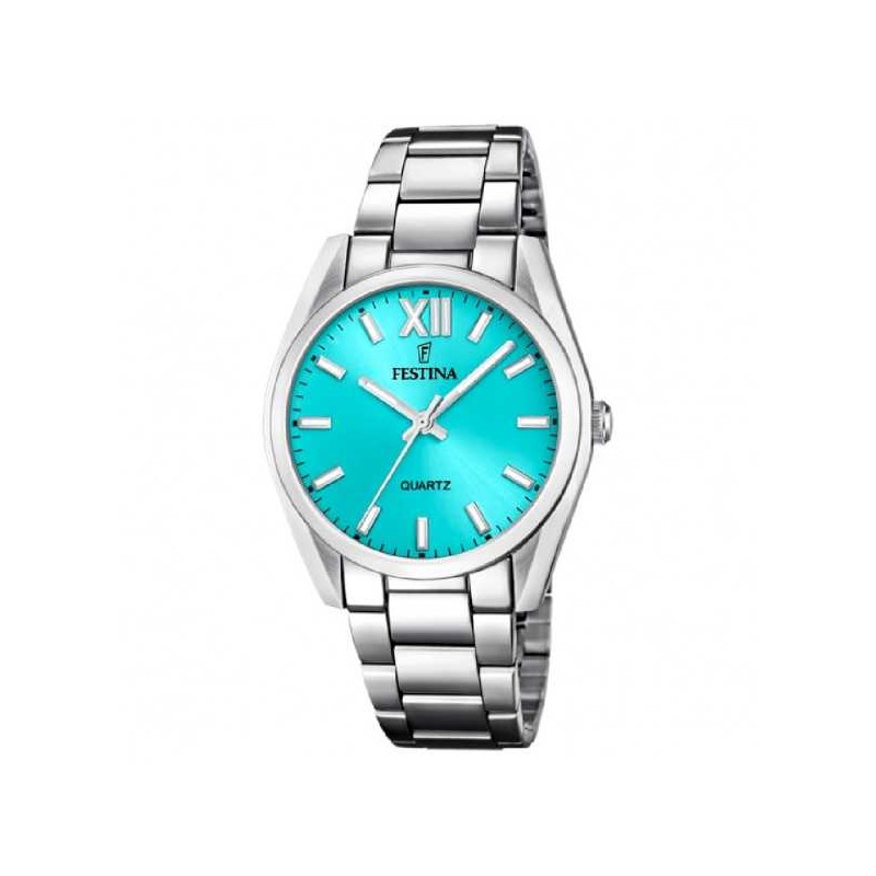 Festina women's wristwatch from the Boyfriend collection with quartz movement and time-only functions. Round silver-tone stainless steel case, 37 mm in diameter and 9.2 mm thick. Light blue analog dial with stick indexes and a Roman numeral at the 12 o'clock position, logo at the top, mineral crystal. Silver-tone stainless steel strap with push-button deployment clasp, water resistance 5 ATM: splash-proof, but not pressurized.