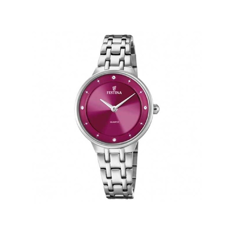 Festian women's wristwatch from the Mademoiselle collection with quartz movement and time-only function. Round silver-tone stainless steel case, 30 mm in diameter and 8 mm thick. Burgundy analog dial with white crystal hour markers, logo at the top, mineral crystal. Silver-tone stainless steel strap with push-button deployment clasp, water resistance 5 ATM: splash-proof, but not pressurized.