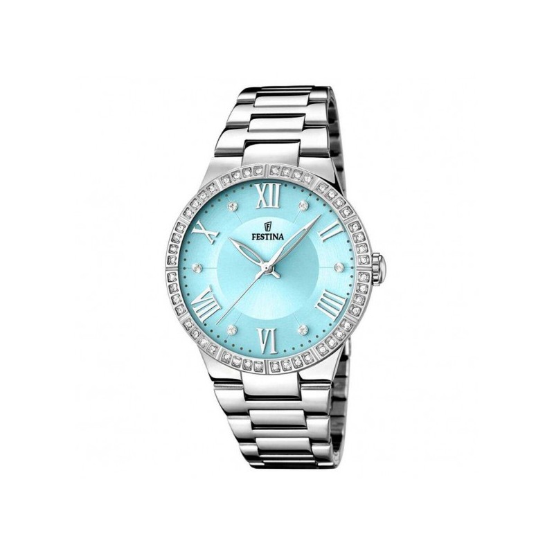 Festina women's wristwatch from the Boyfriend collection with quartz movement and time-only function. Round silver-tone stainless steel case, 36 mm in diameter and 8.8 mm thick, silver-tone steel bezel embellished with white crystals. Light blue analog dial with mixed white crystal indexes and Roman numerals, logo at the top, mineral crystal. Silver-tone stainless steel strap with push-button deployment clasp, water resistance 5 ATM: splash-proof, but not pressurized.