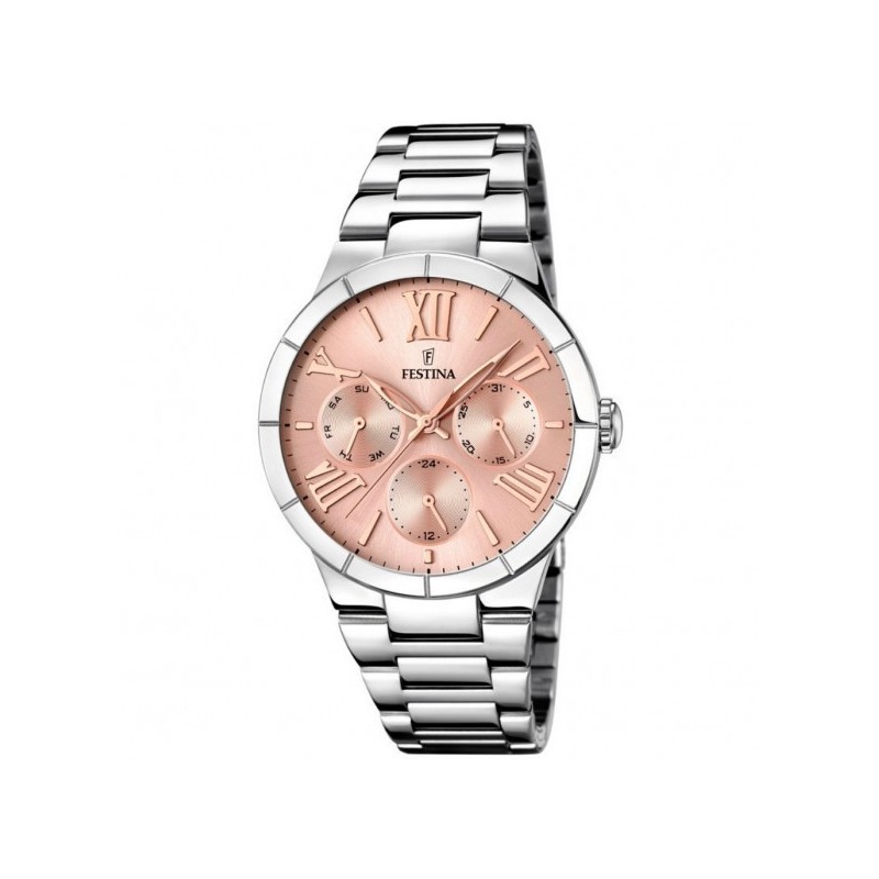 Festina women's wristwatch from the Mademoiselle collection with multifunction quartz movement. Round silver-tone stainless steel case, 36 mm in diameter and 8.8 mm thick. Pink analog dial with mixed baton and Roman numeral indexes, logo at the top, mineral crystal. Silver-tone stainless steel strap with push-button deployment clasp, water resistance 5 ATM: splash-proof but not pressurized.