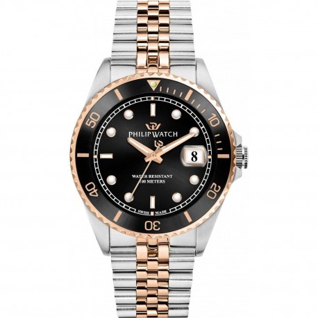 Philip Watch Men's Only Time Watch from the Caribe Collection. Watch with polished and satin-finished steel case measuring 42 × 51, 5mm and black dial. Metal strap in silver and rose gold with double push buckle. Water resistance of 10 atm. Sapphire crystal. Movement mvt eta.
