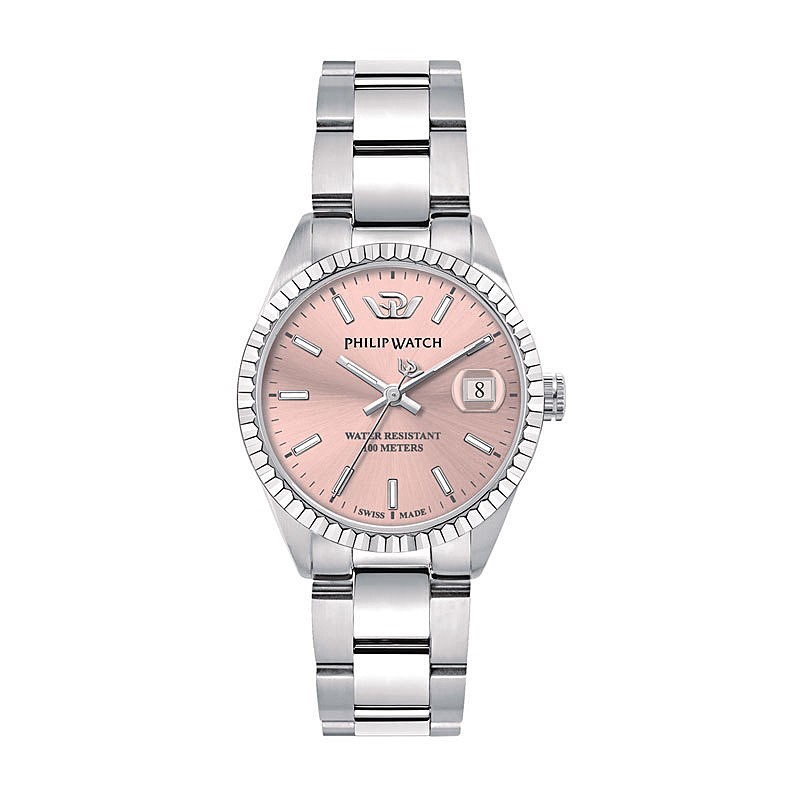 Philip Watch ladies watch from the caribe collection. Time-only functions and quartz movement with swiss made certification. Round stainless steel case with a diameter of 35 mm. Pink dial with baton indexes, logo at 12 o'clock and date window at 3 o'clock. Anti-reflective sapphire crystal. Silver hypoallergenic steel strap deployant clasp with buttons, water resistant 10 atm