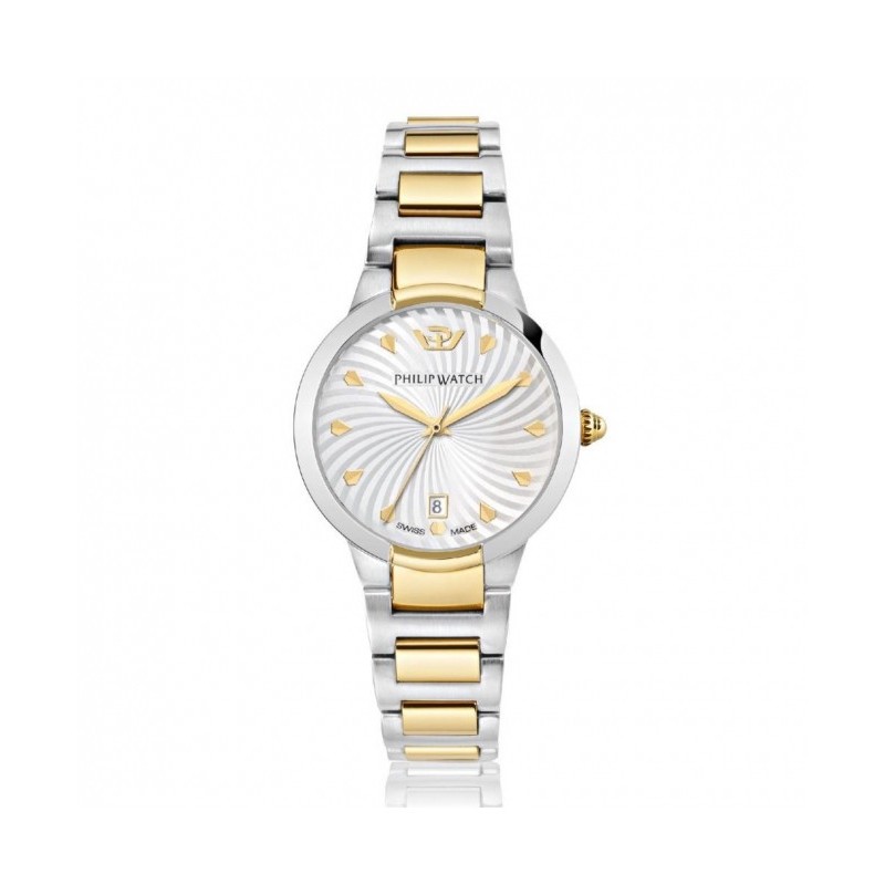 Philip Watch Corley woman time only watch R8253599505 Philip Watch watch from the Corley Collection. Watch Only Time With Quartz Movement With Three Hands: Hours Minutes And Seconds, Case Diameter Of Mm 34, Case Type: Round.White dial with golden indexes, Scratch-resistant sapphire crystal analog display type, The strap / bracelet is made of steel Bicolar Of Steel Color And Yellow Gold Pvd. 5 Atm Water Resistance.