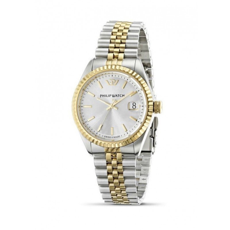PHILIP WATCH CARIBE WATCH - R8253107517 - Philip Watch experience: Urban, Gender: Female, Case Material & Finish: Steel, Case size: 39x31.3mm, Case thickness: 9.15, Case color: gold, Crown and screw back with logo, dial silver colored circular shape, Glass: Sapphire crystal, display type only time, date calendar, Band material: Jubilee mesh steel bracelet, Band color: Silver, Gold, Clasp: Deployment buckle with side push safety, Movement: Quartz with 10 ATM water resistant Swiss made certification