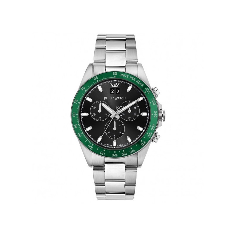 Philip watch men's wristwatch from the Caribe Sport collection with Ronda 5040 quartz movement and chronograph function with date. 42mm diameter silver-tone stainless steel case, bezel with green aluminum insert, screw-down case back and crown, black analog dial with stick indexes, logo at 12 o'clock and date at 12 o'clock, sapphire crystal. Silver-tone stainless steel bracelet with push button deployant clasp, 10 ATM water resistant