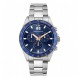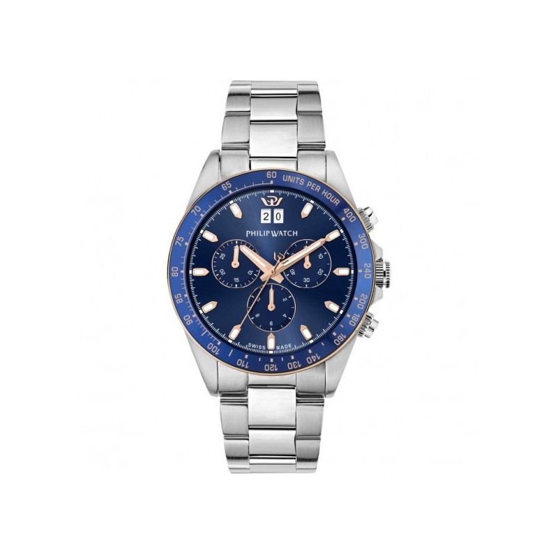 Philip watch men's wristwatch from the Caribe Sport collection with Ronda 5040 quartz movement and chronograph function with date. 42mm diameter silver-tone stainless steel case, bezel with blue aluminum insert, screw-down case back and crown, blue analog dial with rose gold-tone stick indexes, logo at 12 o'clock and date at 12 o'clock, sapphire crystal. Silver-tone stainless steel bracelet with push button deployant clasp, 10 ATM water resistant.