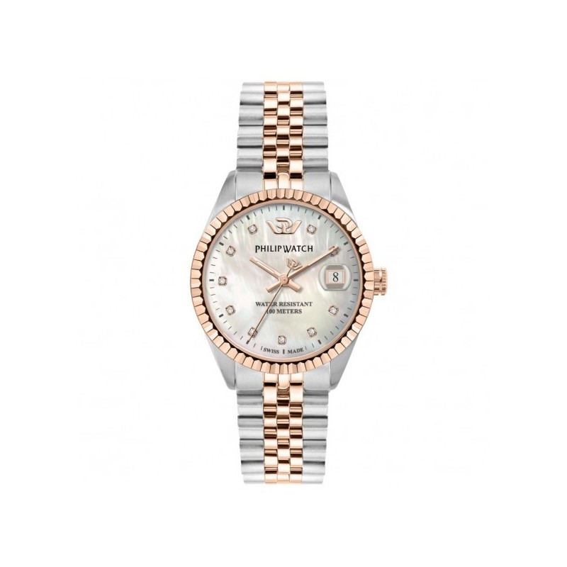 Philip Watch women's wristwatch from the Caribe collection with Swiss quartz movement and time-only functions with date. 35mm diameter silver-tone stainless steel case, rose gold-plated steel knurled bezel, mother-of-pearl analogue dial with diamond-set indexes and date display at 3 o'clock with magnifying glass, sapphire crystal. Two tone silver and rose gold stainless steel bracelet with push button deployant clasp, 10 ATM water resistance