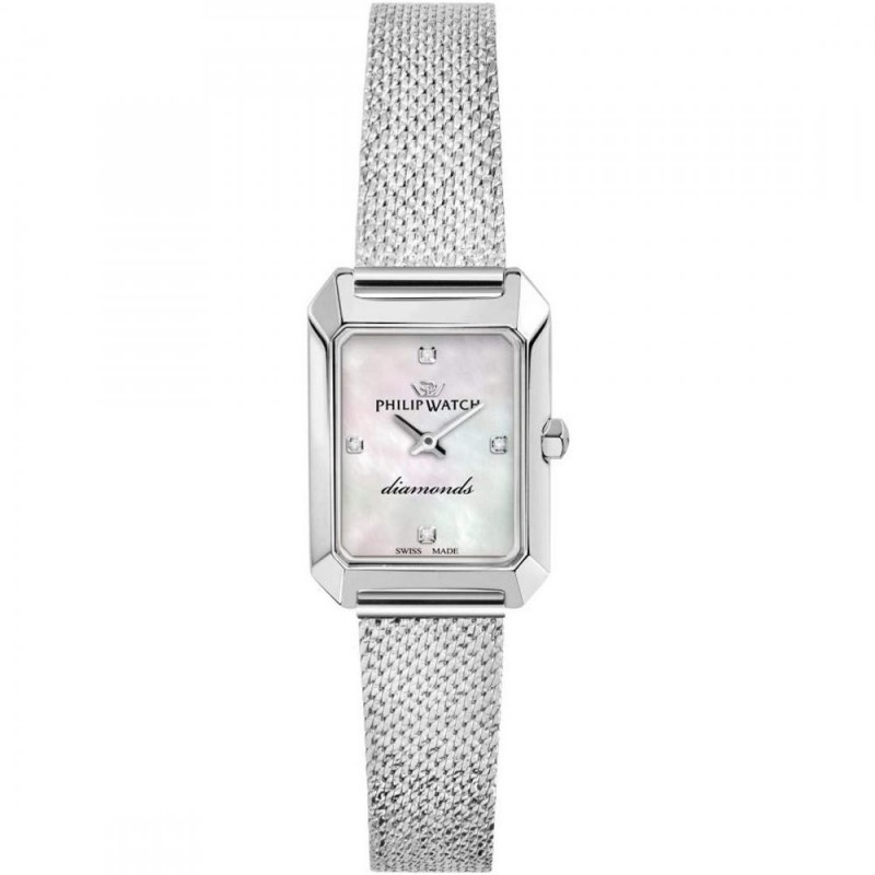 Philip Watch women's wristwatch from the New Port collection with Swiss quartz movement and time-only function. Rectangular stainless steel case measuring 22 mm in diameter, screw-down steel case back, white mother-of-pearl analog dial with four stone indices, logo at the top and center, sapphire crystal. Silver-tone stainless steel Milanese mesh strap with slide clasp, water resistance 5 ATM: splash-proof, but not pressurized.
