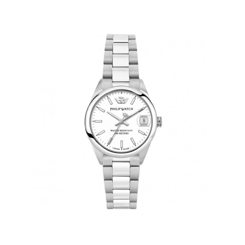 Philip watch women's wristwatch from the Caribe collection with ETA F05.115 Swiss quartz movement and time-only functions with date. Silver-colored steel case with polished and satin finish, 31mm in diameter and 9.15mm thick, screwed case back and crown, white analogue dial with stick hour markers, logo at 12 o'clock and date display at 3 o'clock with magnifying glass, logo on the top, sapphire crystal. Brushed and polished silver-tone stainless steel bracelet with push-button deployant clasp and safety catch, 10 ATM water resistant.