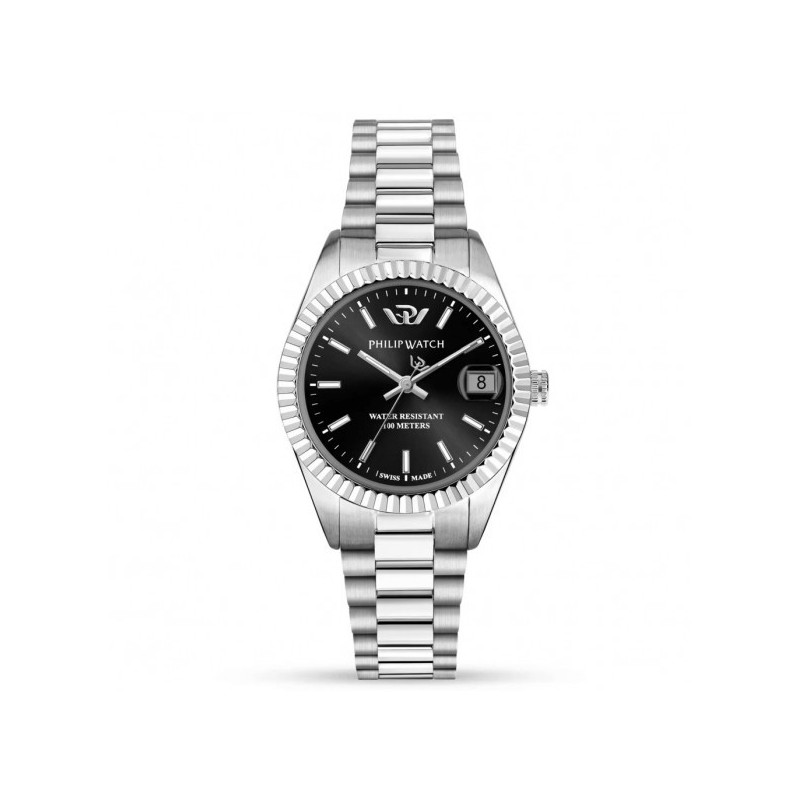 Philip Watch women's wristwatch from the Caribe Urban collection with ETA F04.115 quartz movement and time-only functions with date. Round, silver-tone stainless steel case measuring 28 mm in diameter and 8.95 mm thick, with a silver-tone knurled steel bezel and a screw-down case back for increased water resistance. Black analog dial with stick indexes, logo at 12 o'clock, and date display at 3 o'clock with a magnifying glass, scratch-resistant and anti-reflective sapphire crystal. Silver-tone stainless steel strap with a push-button butterfly clasp, 10 ATM water resistance.