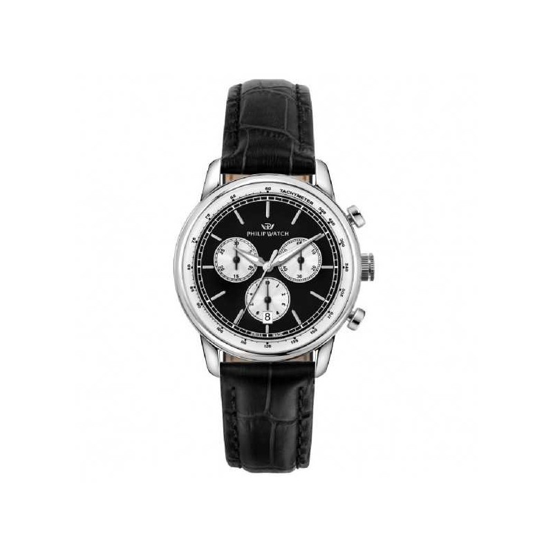 Philip Watch men's wristwatch from the Anniversaries collection with RONDA 5040D quartz movement and chronograph functions with date. Round, silver-tone stainless steel case, 40 mm in diameter and 10.75 mm thick, polished finish. Screw-down case back and crown.