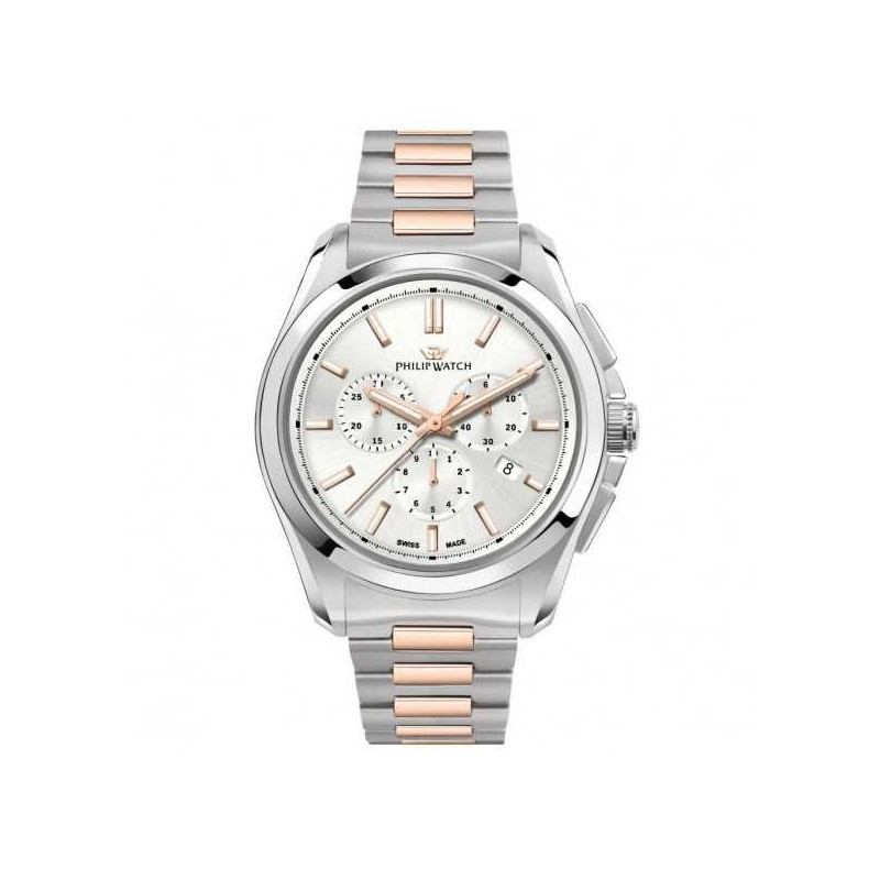 Philip Watch men's wristwatch from the Amalfi collection with RONDA 5040 quartz movement and chronograph functions with date. Round silver-tone stainless steel case, 43 mm in diameter and 10.80 mm thick. Screw-down case back and crown. Silver analog dial with rose gold-tone stick indexes and date display at 4 o'clock, anti-reflective sapphire crystal. Two-tone silver and rose gold stainless steel strap with push-button deployment clasp, 10 ATM water resistance.