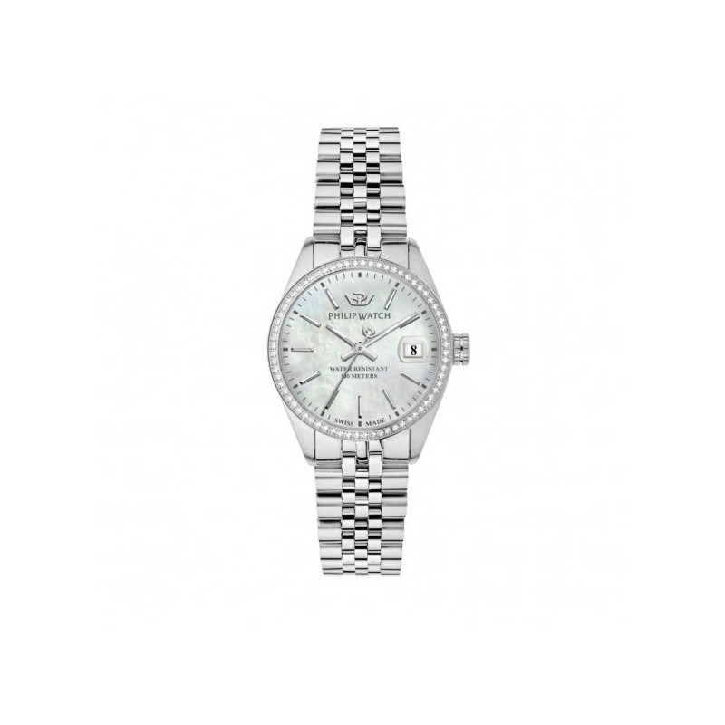 Philip Watch women's wristwatch from the Caribe Diamonds collection with Ronda 505 quartz movement and time-only function with date. Round stainless steel case measuring 31 mm in diameter and 9.15 mm thick, with a screw-down case back and crown. Steel bezel embellished with a diamond border. Mother-of-pearl analog dial with silver-tone stick indexes, date display at 3 o'clock, logo at the top, sapphire crystal. Silver-tone stainless steel Jubilee mesh strap with push-button deployment clasp and safety lock, water resistant to 10 ATM.
