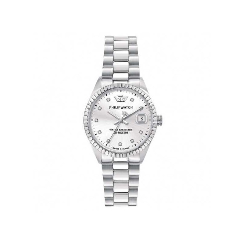 Philip Watch women's wristwatch from the Caribe collection with quartz movement and time-only function with date. Round silver-tone stainless steel case, 31 mm in diameter and 9 mm thick, with a knurled silver-tone steel bezel. Silver-tone analog dial with diamond indexes, date display at 3 o'clock with a magnifying glass, logo at the top, sapphire crystal. Silver-tone stainless steel strap with polished and satin finish, push-button deployment clasp, 10 ATM water resistance.