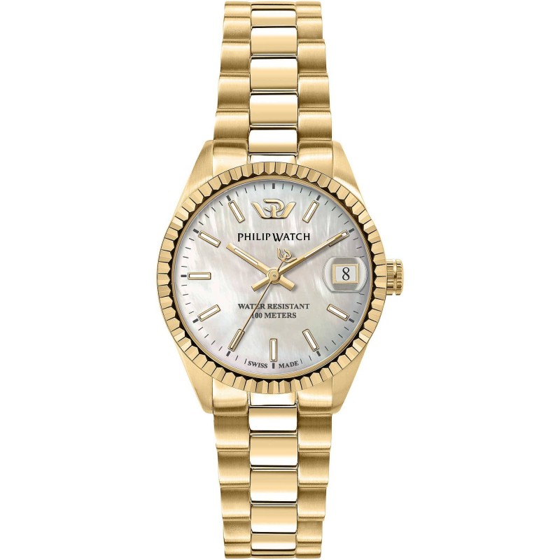 Philip Watch women's wristwatch from the Caribe collection with quartz movement and time-only function with date. Round, gold-tone stainless steel case, 31 mm in diameter, screw-down case back and crown, and knurled gold-tone steel bezel. Analog mother-of-pearl dial with stick indexes, date display at 3 o'clock with magnifying lens, logo at the top, sapphire crystal. Gold-tone stainless steel Jubilee mesh strap with polished and satin finish, push-button deployment clasp and safety catch, water resistant to 10 ATM.