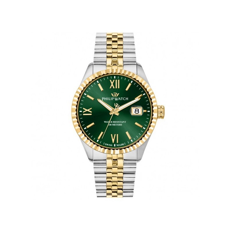 Philip Watch men's wristwatch from the Caribe Urban collection with ETA F06.115 quartz movement and time-only functions with date. Round, gold-tone stainless steel case, 41 mm in diameter, with a gold-tone knurled bezel.