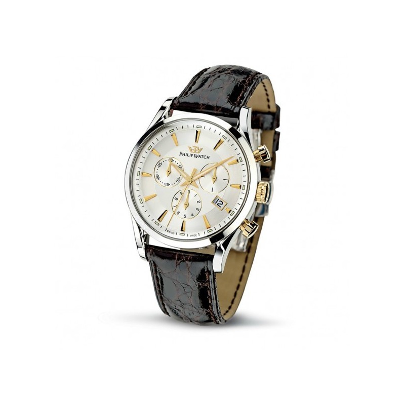 Philip Watch men's wristwatch from the Sunray collection with Ronda 5040D quartz movement and chronograph functions with date. Round, silver-tone stainless steel case, 39 mm in diameter and 13.2 mm thick, with a polished silver-tone steel bezel. Silver analog dial with gold-tone stick indexes, date display at 4 o'clock, logo at the top, mineral crystal. Polished brown leather strap with pin buckle closure, water resistant to 10 ATM.