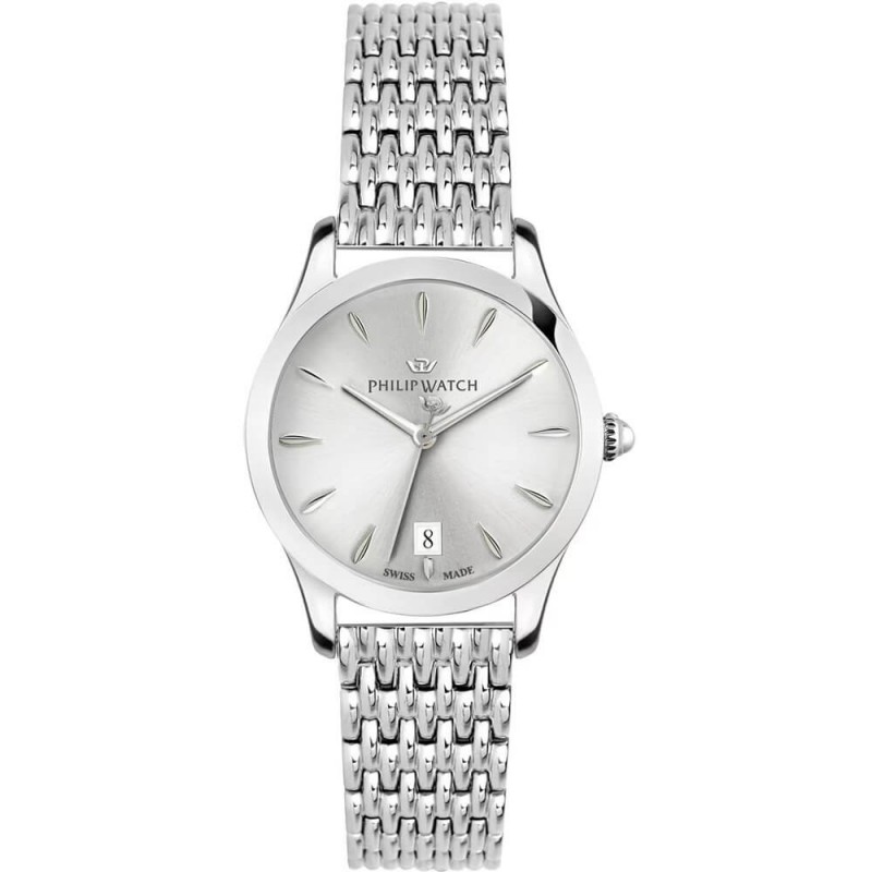 Philip Watch women's wristwatch from the Grace collection with Ronda 505 quartz movement and time-only function with date. Round silver-tone stainless steel case, 32 mm in diameter and 8.75 mm thick, with a screw-down steel case back. Silver analog dial with stick indexes, date display at 6 o'clock, logo at the top, sapphire crystal. Silver-tone stainless steel strap with push-button deployment clasp, 10 ATM water resistance.