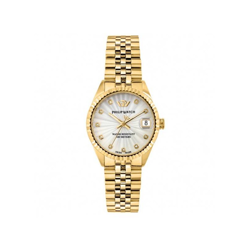 Philip Watch women's wristwatch from the Caribe collection with Swiss quartz movement and time-only function with date. Round gold-tone stainless steel case, 31 mm in diameter and 9 mm thick, screw-down steel case back and crown, and gold-tone knurled steel bezel. Silver-tone analog wave dial with diamond indexes and gold-tone details, date window at 3 o'clock with magnifying glass, logo at the top, sapphire crystal. Gold-tone stainless steel Jubilee mesh strap with deployant clasp and safety catch, water resistant to 10 ATM.
