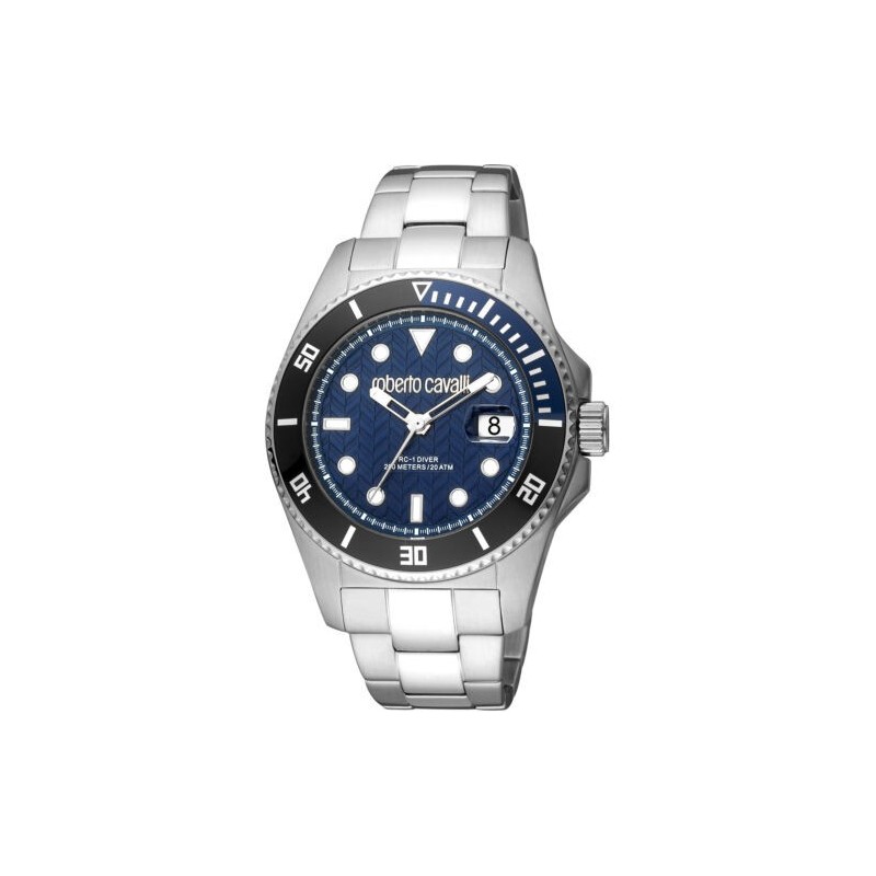 Roberto Cavalli men's wristwatch with quartz movement and time-only function with date. Round silver-tone stainless steel case, 44 mm in diameter and 12 mm thick, black and blue enameled steel bezel with minute track. Blue analog dial with geometric indices, date display at 3 o'clock, logo on the top, mineral crystal. Silver-tone stainless steel strap with push-button deployment clasp, 10 ATM water resistance.