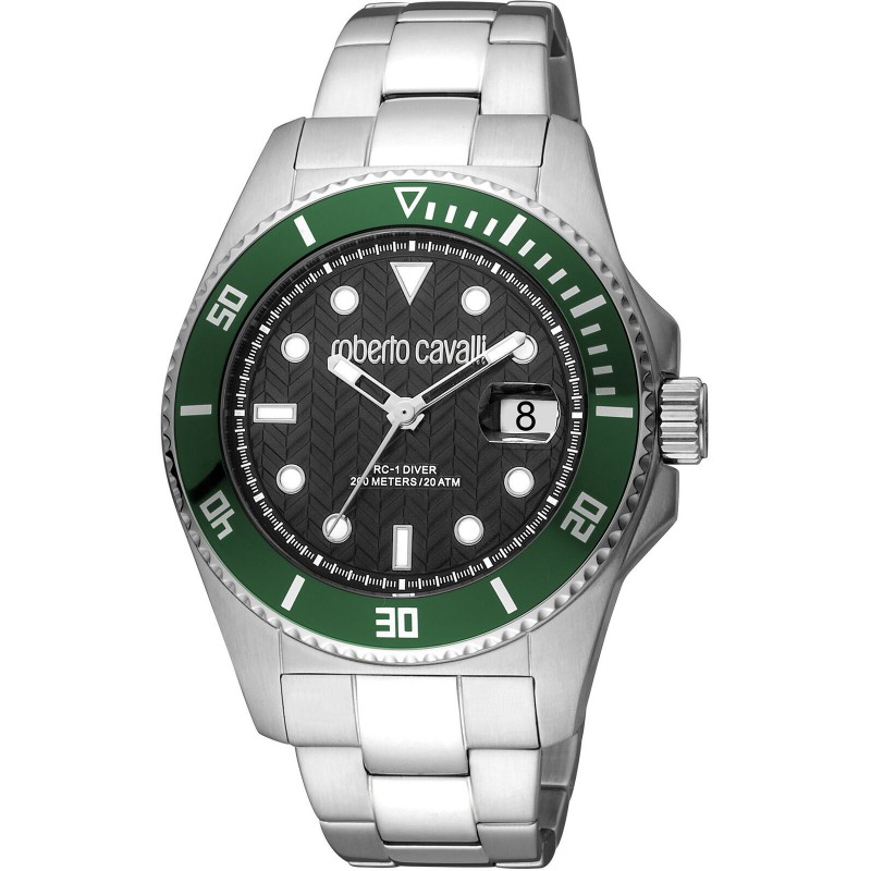 Roberto Cavalli men's wristwatch with quartz movement and time-only function with date. Round, silver-tone stainless steel case, 44 mm in diameter and 12 mm thick, with a green enameled steel bezel and minute track. Black analog dial with geometric indices, date display at 3 o'clock, logo at the top, mineral crystal. Silver-tone stainless steel strap with push-button deployment clasp, 10 ATM water resistance.