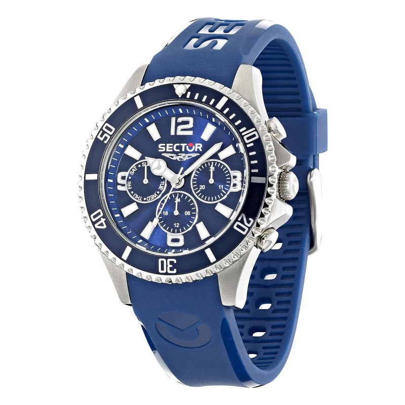 Sector men's chronograph watch from the 230 collection. 43 mm diameter silver-colored steel case, bright blue analog dial with white stick indexes, date and chronograph function, mineral glass, blue and silver-colored steel knurled bezel, strap in blue silicone with pin buckle closure, quartz movement, water resistance: 10 ATM