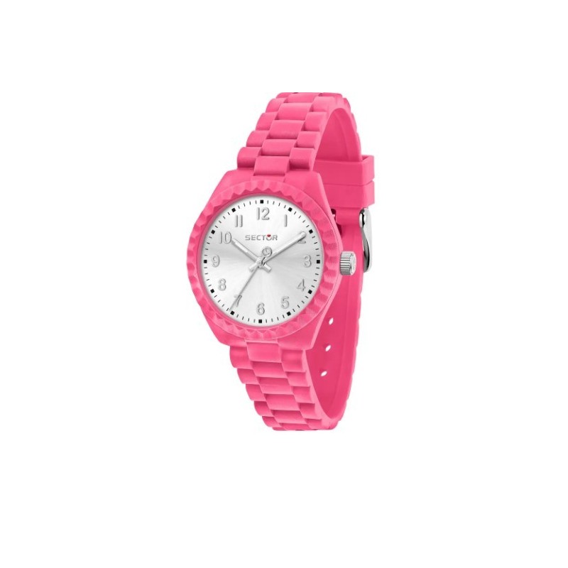 Sector women's wristwatch from the Diver collection with quartz movement and time-only function. Round shaped pink nylon case with a diameter of 32mm, pink knurled bezel, white analogue dial with Arabic numeral indices, logo on the top, mineral glass. Pink silicone strap with pin buckle closure, 5 ATM water resistant: resistant to splashes of water but not under pressure.