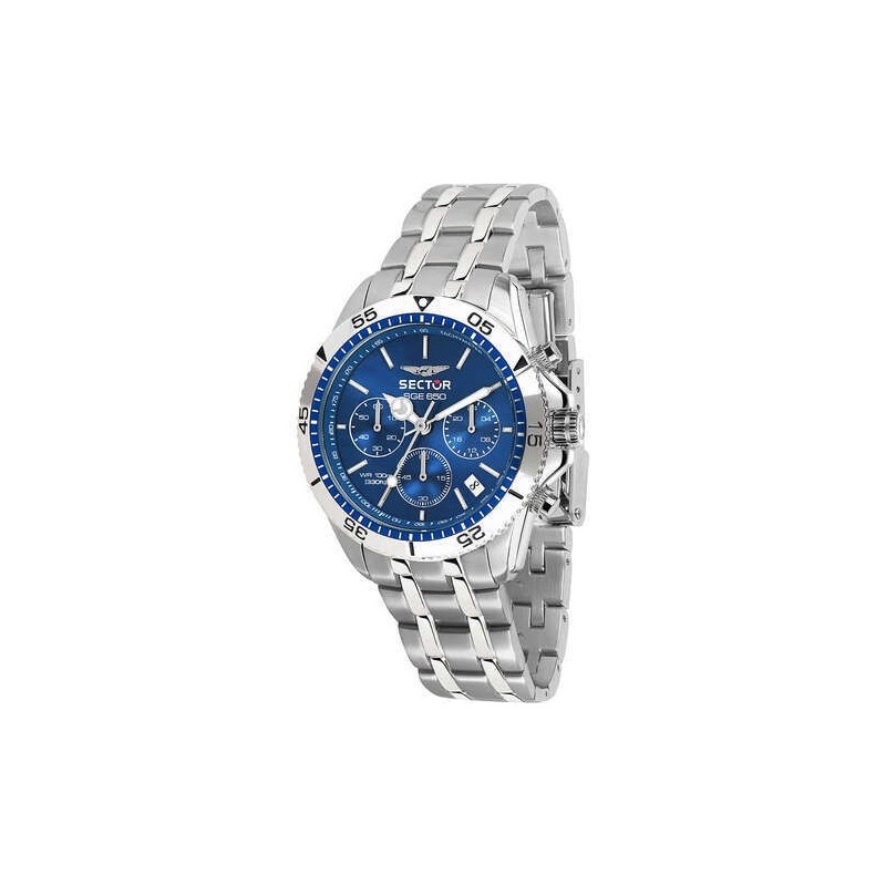 Sector men's wristwatch from the Sge 650 collection with quartz movement and chronograph function with date. Round-shaped silver-colored stainless steel case with a diameter of 42 mm and a thickness of 12.10 mm, polished and satin finish, silver steel bezel with minute indicator, blue analog dial with silver-colored baton indexes, date window between 4 and 5 o'clock , logo on the top, mineral glass with sapphire treatment. Silver-tone stainless steel strap with diver's buckle closure and safety lock, 10 ATM water resistant.