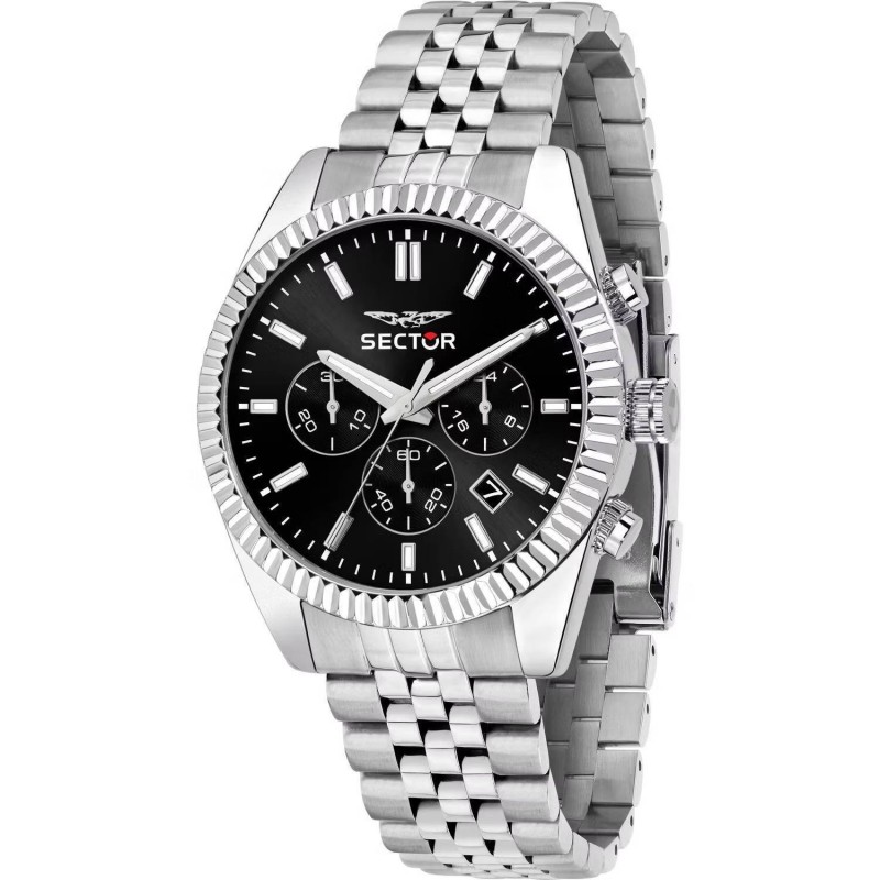 Sector men's wristwatch from the 240 collection with quartz movement and chronograph function with date. Round-shaped silver-colored stainless steel case with a diameter of 41 mm and a thickness of 10.70 mm, knurled silver-colored steel bezel. Black analogue dial with baton indexes, date display between 4 and 5, logo on the top, mineral glass. Silver-tone stainless steel strap with diver's buckle closure and safety lock, 5 ATM water resistant: resistant to splashes of water but not under pressure.