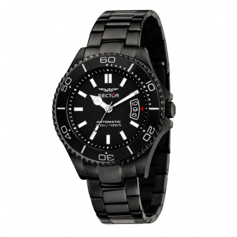 Sector men's wristwatch from the 230 collection with Miyota 8215 automatic movement and time-only function with date. Round-shaped stainless steel case with black IP treatment with a diameter of 43 mm and a thickness of 14.20 mm, black stainless steel bezel with knurled outline and minute ring. Black analogue dial with stick indexes, date display at 3 o'clock, logo on the top, mineral glass with sapphire treatment. Stainless steel strap with black IP treatment and diver's buckle closure, buttons and safety lock, 3 ATM water resistant: resistant to splashes of water but not under pressure.