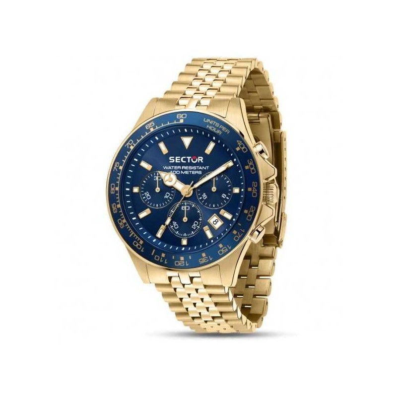 Sector men's wristwatch from the 230 collection with quartz movement and chronograph function with date. Round stainless steel case with IP gold treatment, 43 mm in diameter and 11.80 mm thick, blue steel bezel. Blue analogue dial with baton indexes, golden details, logo at the top and date display between 4 and 5 o'clock, mineral glass. Stainless steel strap with IP gold treatment in jubilee mesh and deployant clasp, 10 ATM water resistant.