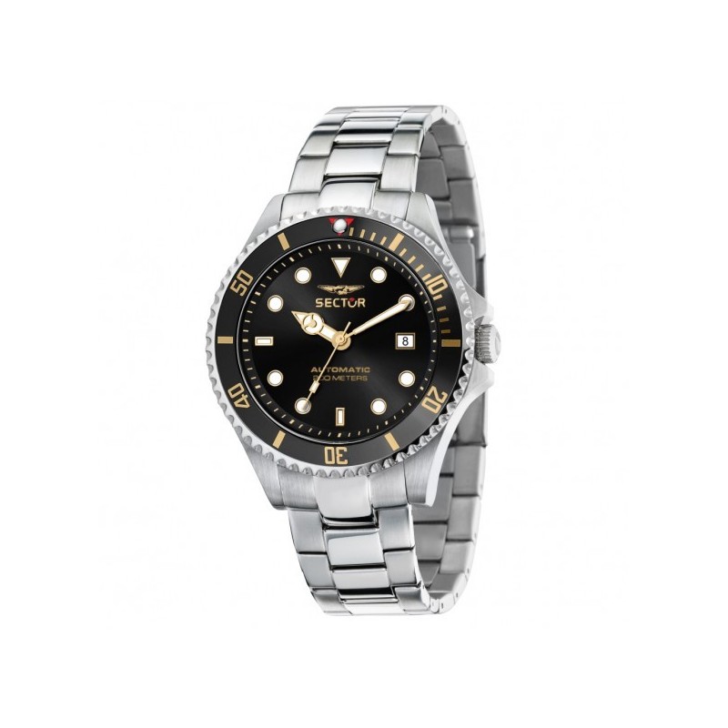 Sector men's wristwatch from the 230 Automatic Recycled collection with Miyota 8215 automatic movement and time-only function with date. Round, silver-tone recycled stainless steel case, 43 mm in diameter and 13.20 mm thick. Black IP-treated bezel with minute track. Black dial with applied indexes, logo at the top, and date display at 3 o'clock with a magnifying lens, sapphire crystal. Silver-tone stainless steel strap with push-button deployment clasp, 20 ATM water resistance.