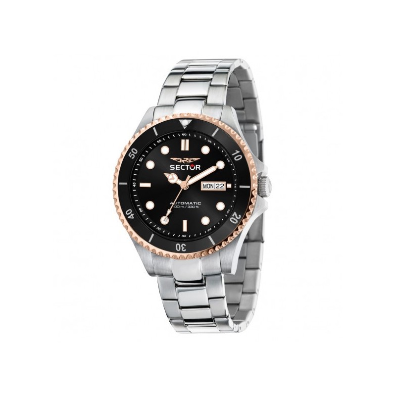 Sector men's wristwatch from the 230 Automatic collection with Miyota 8205 automatic movement and time-only function with date. Round, silver-tone stainless steel case, 43 mm in diameter and 13.10 mm thick. Rose gold-plated bezel with black ceramic insert and minute track. Screw-down case back.