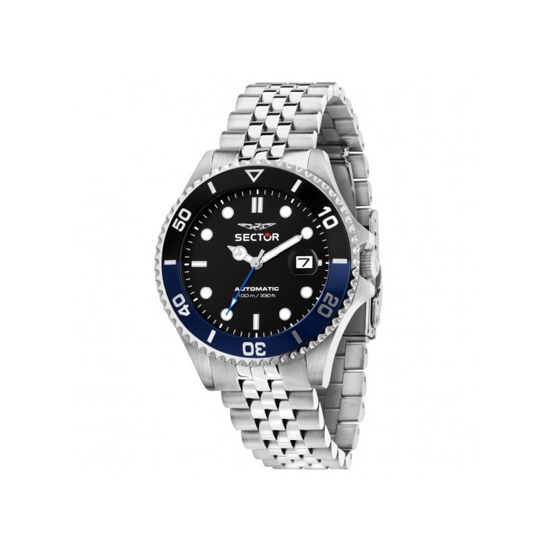 Sector men's wristwatch from the 230 Automatic collection with Miyota 8205 automatic movement and time-only function with date. Round silver-tone stainless steel case, 43 mm in diameter and 13.10 mm thick. Blue and black aluminum bezel.