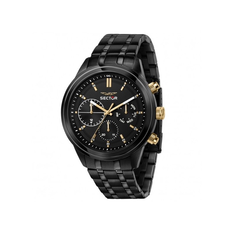 Sector men's wristwatch from the 670 collection with Epson VX9JE quartz movement and chronograph function with date. Round black IP stainless steel case, 45 mm in diameter and 10.20 mm thick. Gold-tone crown and side buttons. Black dial with gold-tone stick indexes, logo at the top, and date display with day and week, mineral crystal. Black IP stainless steel strap with push-button deployment clasp and safety catch, water resistant to 5 ATM: splashes of water, but not pressurized.