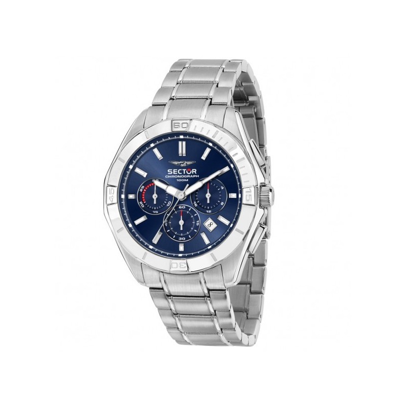 Sector men's wristwatch from the 790 collection with JS25 quartz movement and chronograph functions with date. Round silver-tone stainless steel case, 42 mm in diameter and 11.50 mm thick. Blue dial with stick indexes, logo at the top, and date display between 4 and 5 o'clock. Sapphire crystal. Silver-tone stainless steel strap with push-button deployment clasp and safety lock, water resistant to 10 ATM.